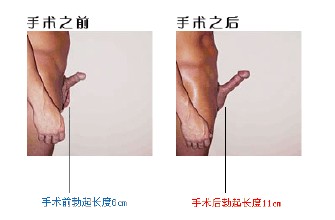 曙光医院曾追踪185例患者,追踪期3个月到4年之间,阴茎加粗1.8~3.2厘米(平均2.5厘米);关于阴茎长度,其中83例增长3.1~5.2厘米(平均 4.1厘米),仅2例情况较特殊无法延长过多,仅延长1.1cm。其中有1例术后有血肿现象,但wq未出现感觉变钝或发炎等可能并发症。推论统计的测验显示本手术是有意义的,据跟踪回访,患者认为手术在主观上行动上都一定程度上解决了问题。不仅术后性生活质量有所提高,更重要的是整个人会变得更为自信,从另一方面也促进了性生活更加合谐。